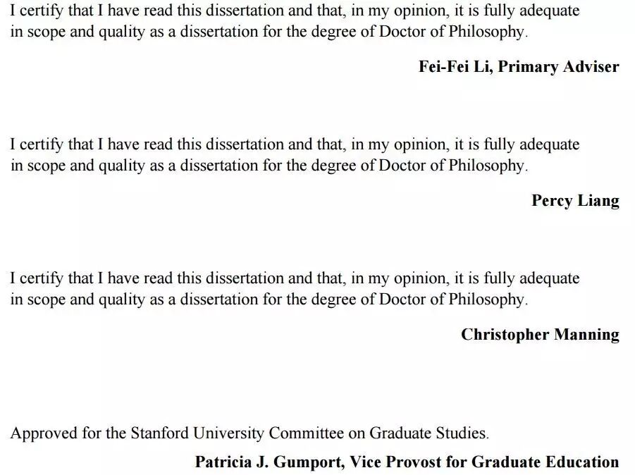 在这篇学位论文中,我们开发了让我们可以将视觉数据领域和自然语言话语领域连接起来的模型和技术,从而让我们可以实现两个领域中元素的互译。具体来说,首先我们引入了一个可以同时将图像和句子嵌入到一个共有的多模态嵌入空间(multi-modal embedding space)中的模型。然后这个空间让我们可以识别描绘了一个任意句子描述的图像,而且反过来我们还可以找出描述任意图像的句子。其次,我们还开发了一个图像描述模型(image captioning model),该模型可以根据输入其的图像直接生成一个句子描述——该描述并不局限于人工编写的有限选择集合。最后,我们描述了一个可以定位和描述图像中所有显著部分的模型。我们的研究表明这个模型还可以反向使用:以任意描述(如:白色网球鞋)作为输入,然后有效地在一个大型的图像集合中定位其所描述的概念。我们认为这些模型、它们内部所使用的技术以及它们可以带来的交互是实现人工智能之路上的一块垫脚石,而且图像和自然语言之间的连接也能带来许多实用的益处和马上就有价值的应用。