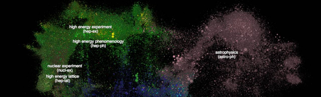 人类一小部分知识的 t-SNE 可视化。每一个圈圈都是一篇 arxiv 论文,大小代表参考文献的数量。