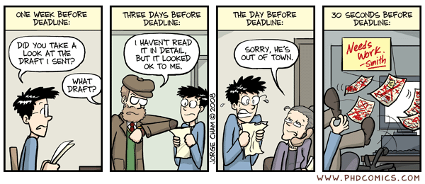 提前两周的内部截至时间。并没有许多实验室这样做,但幸运的是飞飞对这个提前两周的内部截至时间限制很是坚定,在这个时间,你必须提交至少 5 页带有所有最终实验的草稿(即使不是最终的数字);这份草稿会进入一个与外部完全一样的内部评审过程(具有相同的评审表等等)我发现这种做法非常有用,因为这会迫使你思考整篇论文的布局,从而总是能让你彰显出一些你必须为这篇论文的思路而运行的关键实验,并让论据思路条理清晰、连贯和有说服力。